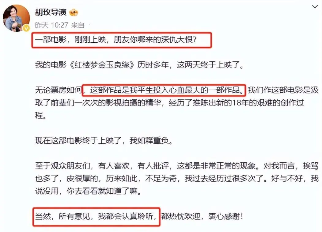 面对如此惨烈的市场反馈,胡玫导演显然有些撑不住了。