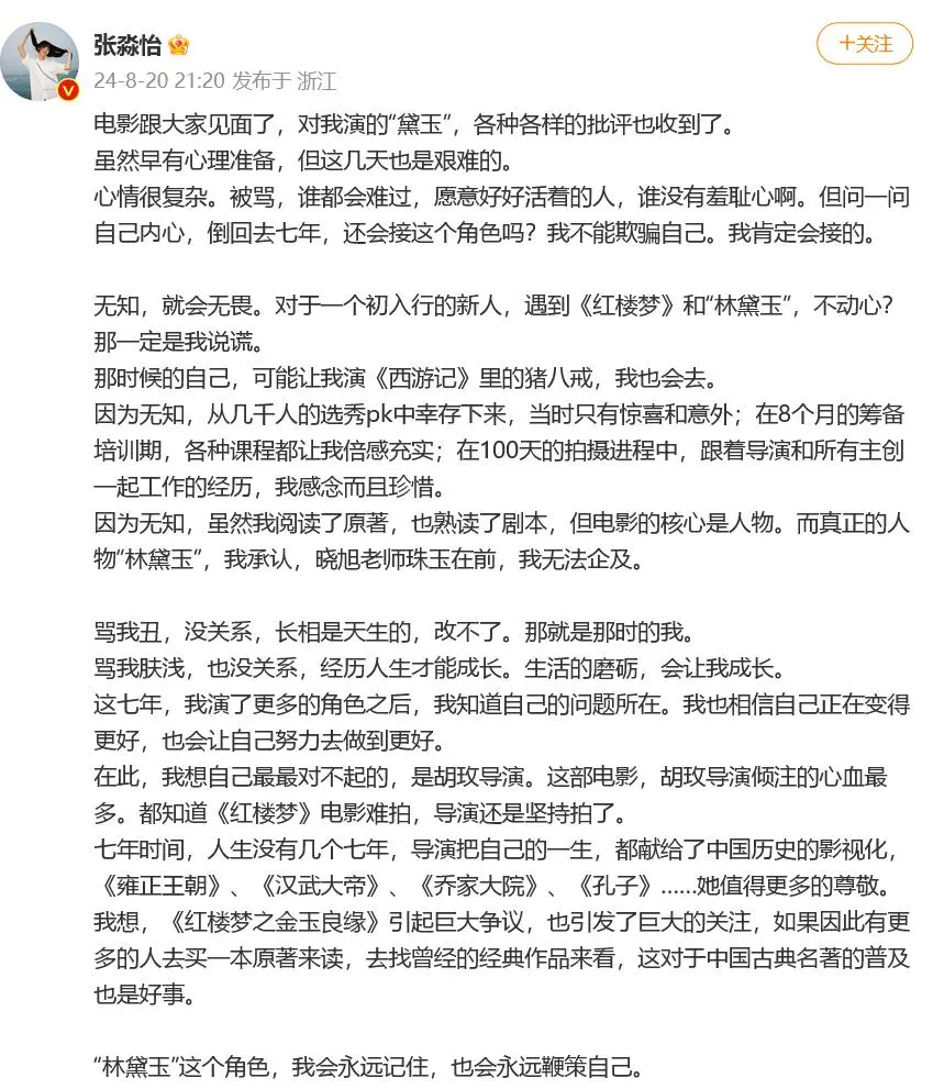 张淼怡事后也发了一篇道歉信,字里行间都是对不起导演。