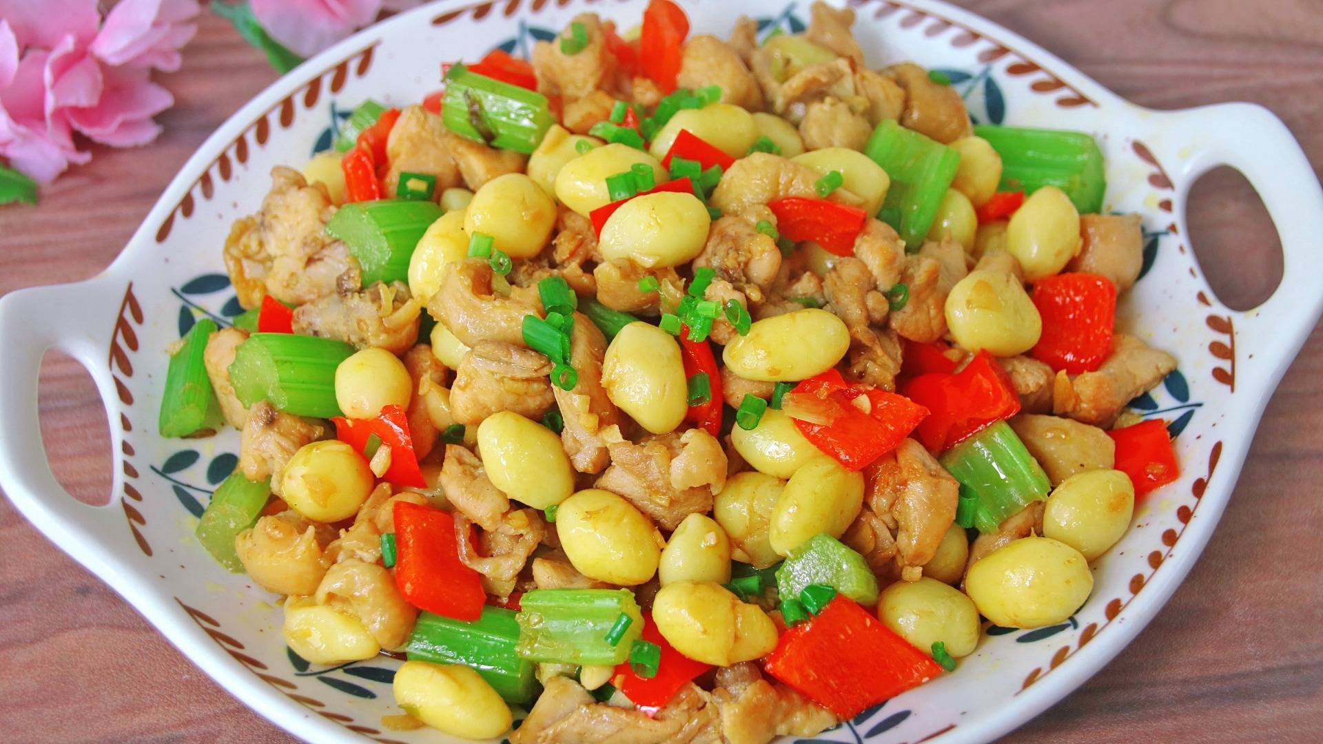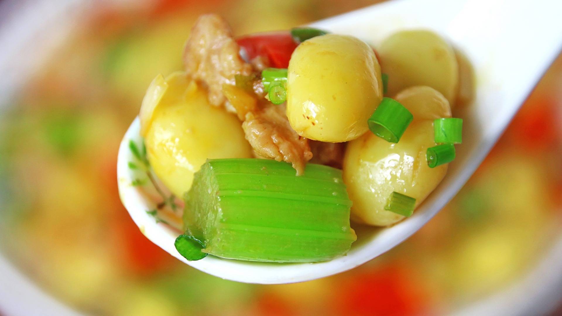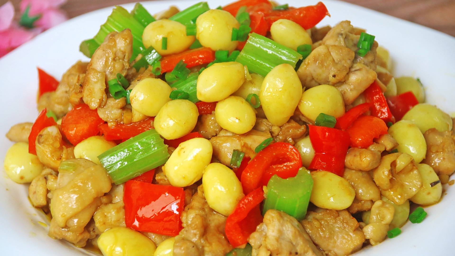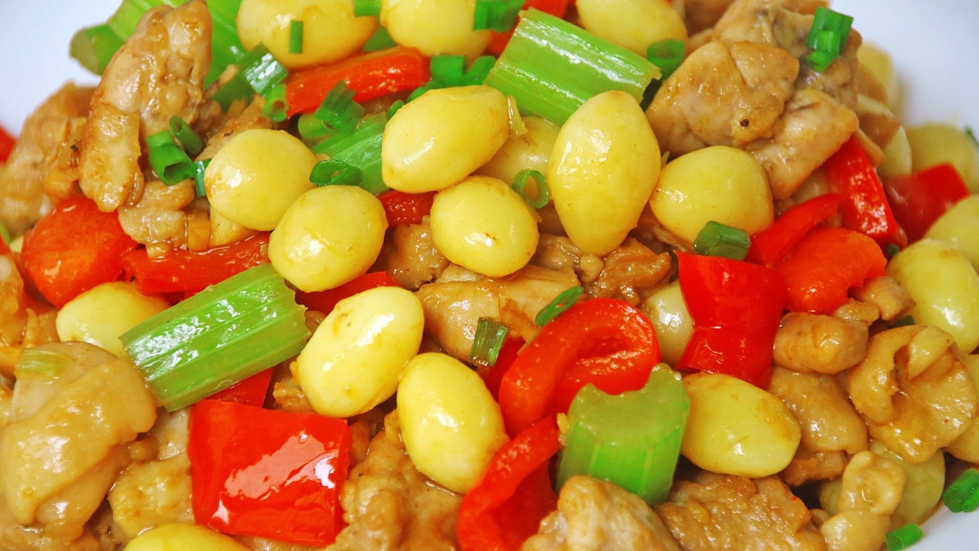 【制作主料】:白果、鸡腿肉、红菜椒、芹菜