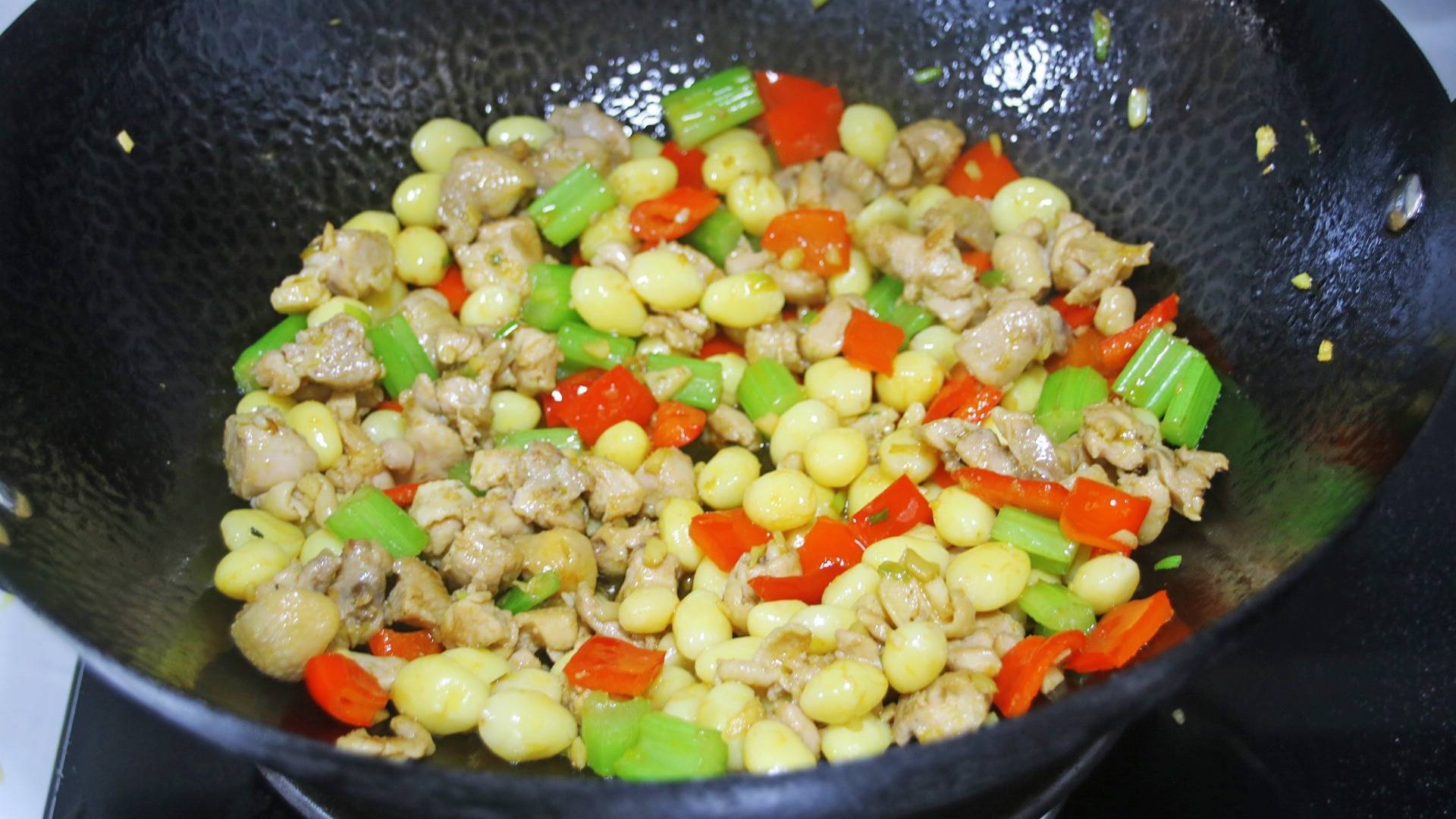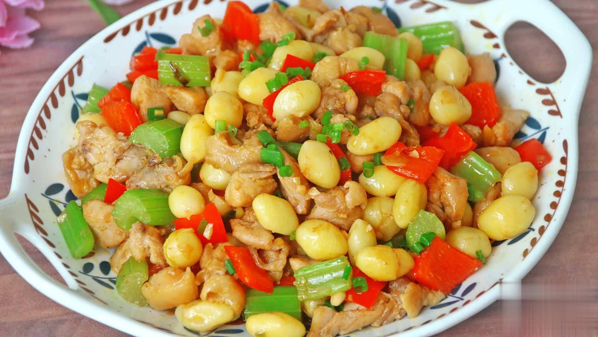 然后倒入煮好的白果、鸡丁,调味加盐、生抽、少许白糖提鲜、半勺香醋继续翻炒2分钟;