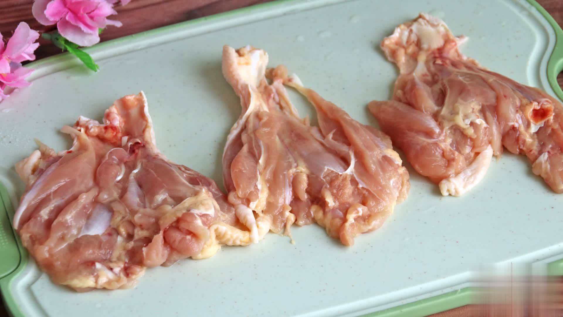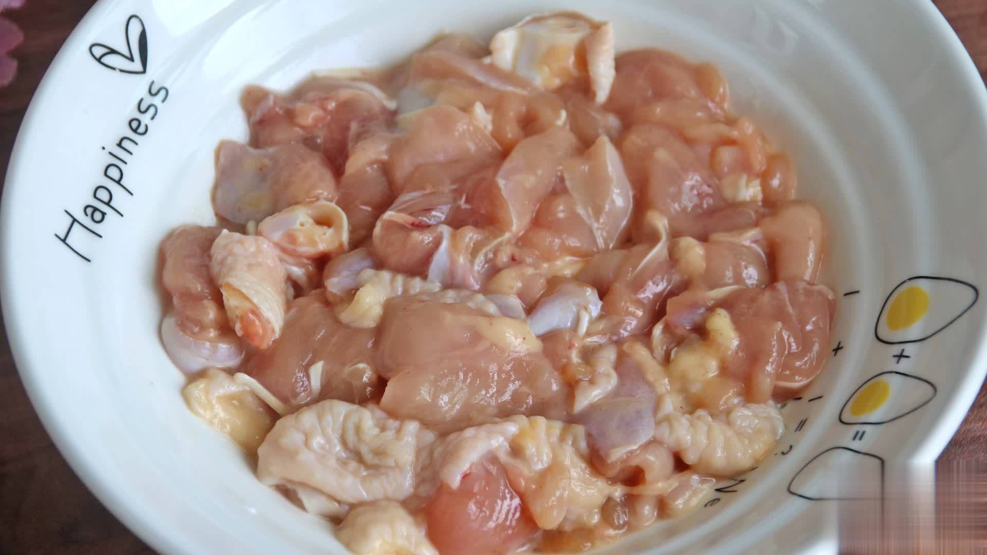 第三步:鸡腿肉皮朝上,用刀背斩断羁绊的筋膜,再切成约宽2厘米的条,再切成丁,加适量盐、料酒、生抽、半个蛋清、少许生粉,戴上一次性手套抓拌上劲,腌制10分钟;