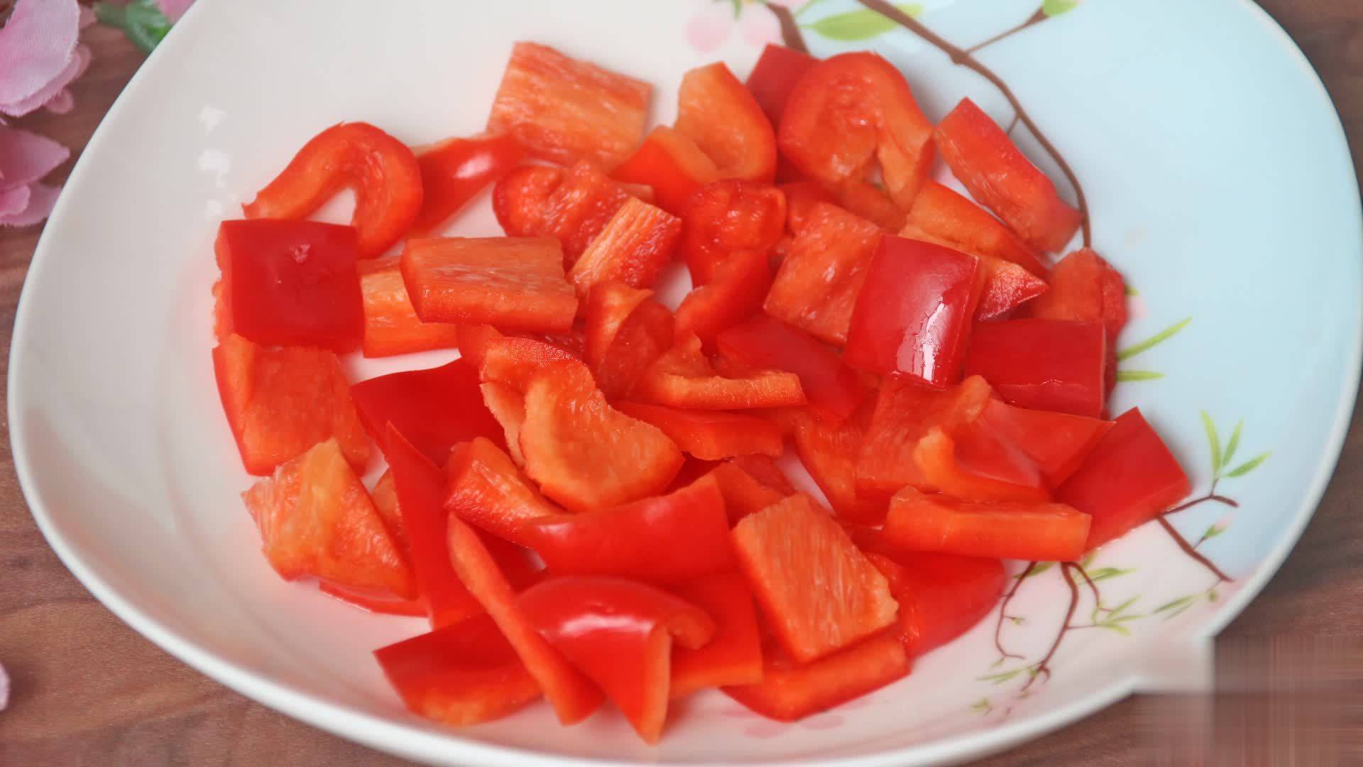 第四步:红菜椒一个,清洗干净后去蒂,先切条再切小丁,切成和银杏果一般的大小即可;