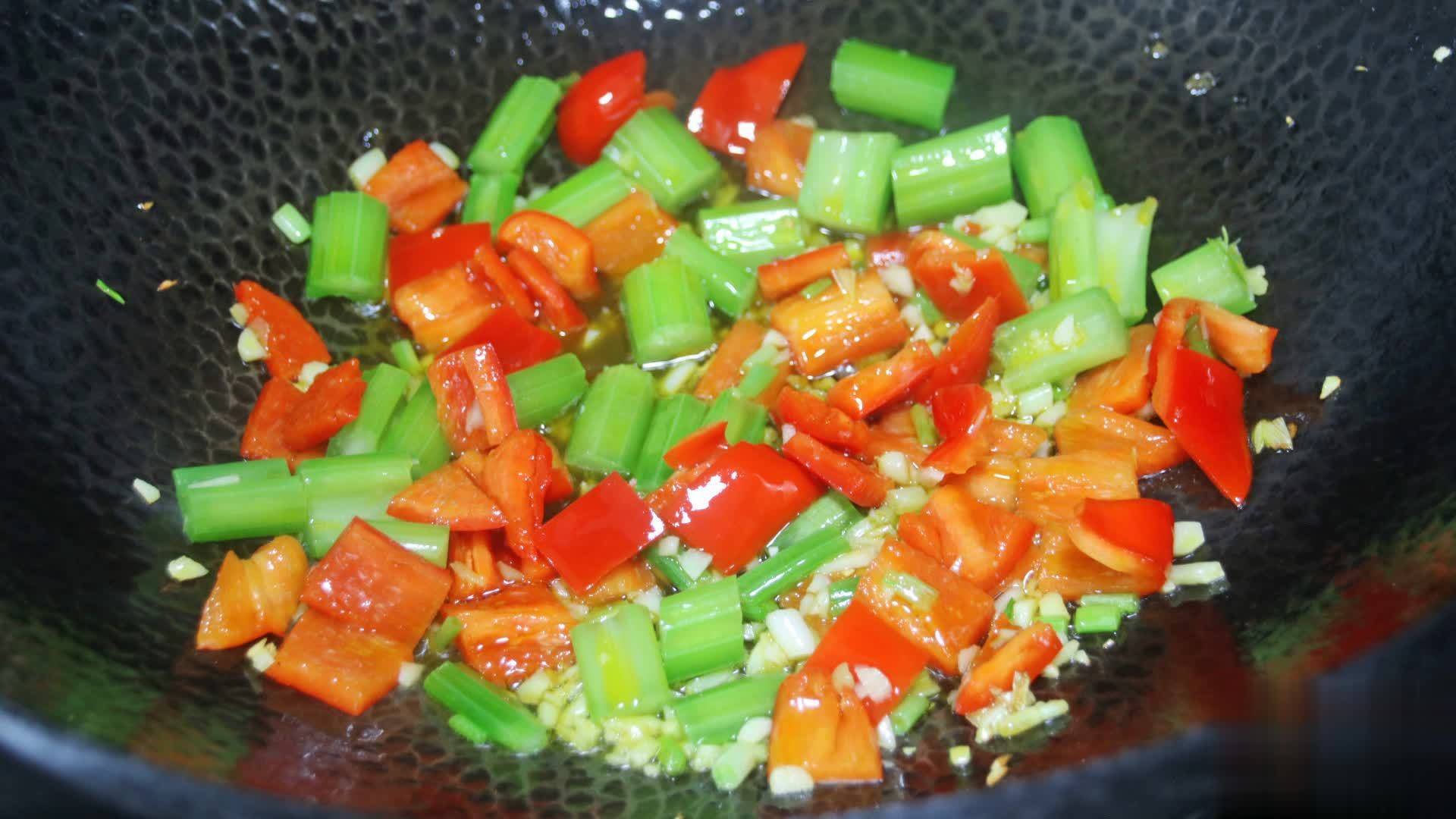 第十步:油锅中倒入葱姜蒜爆香,接着放入芹菜和红椒丁大火翻炒2分钟炒至断生,