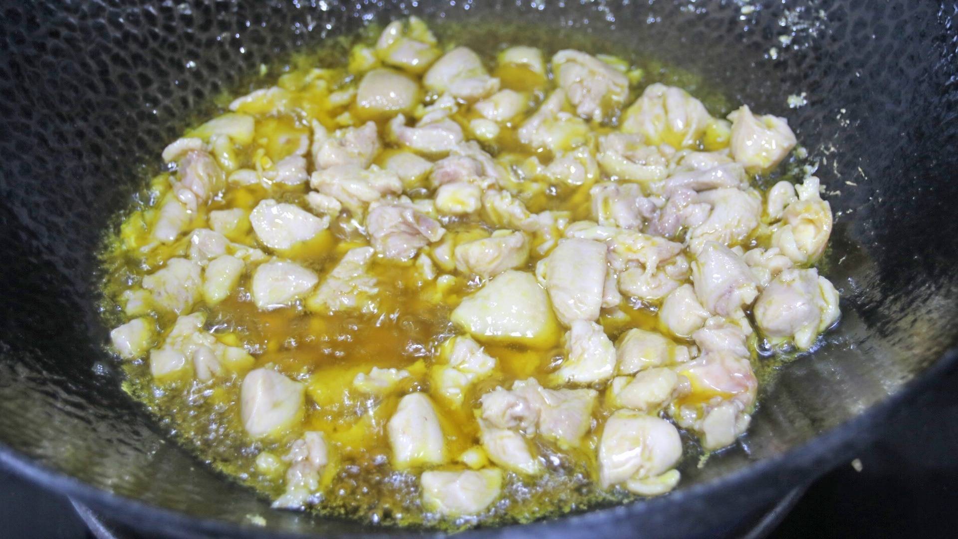 第九步:锅中烧油,油温7成热倒入姜末,炒香后将腌好的鸡肉倒入锅中大火翻炒,翻炒到鸡肉变色发白,然后捞出沥油;