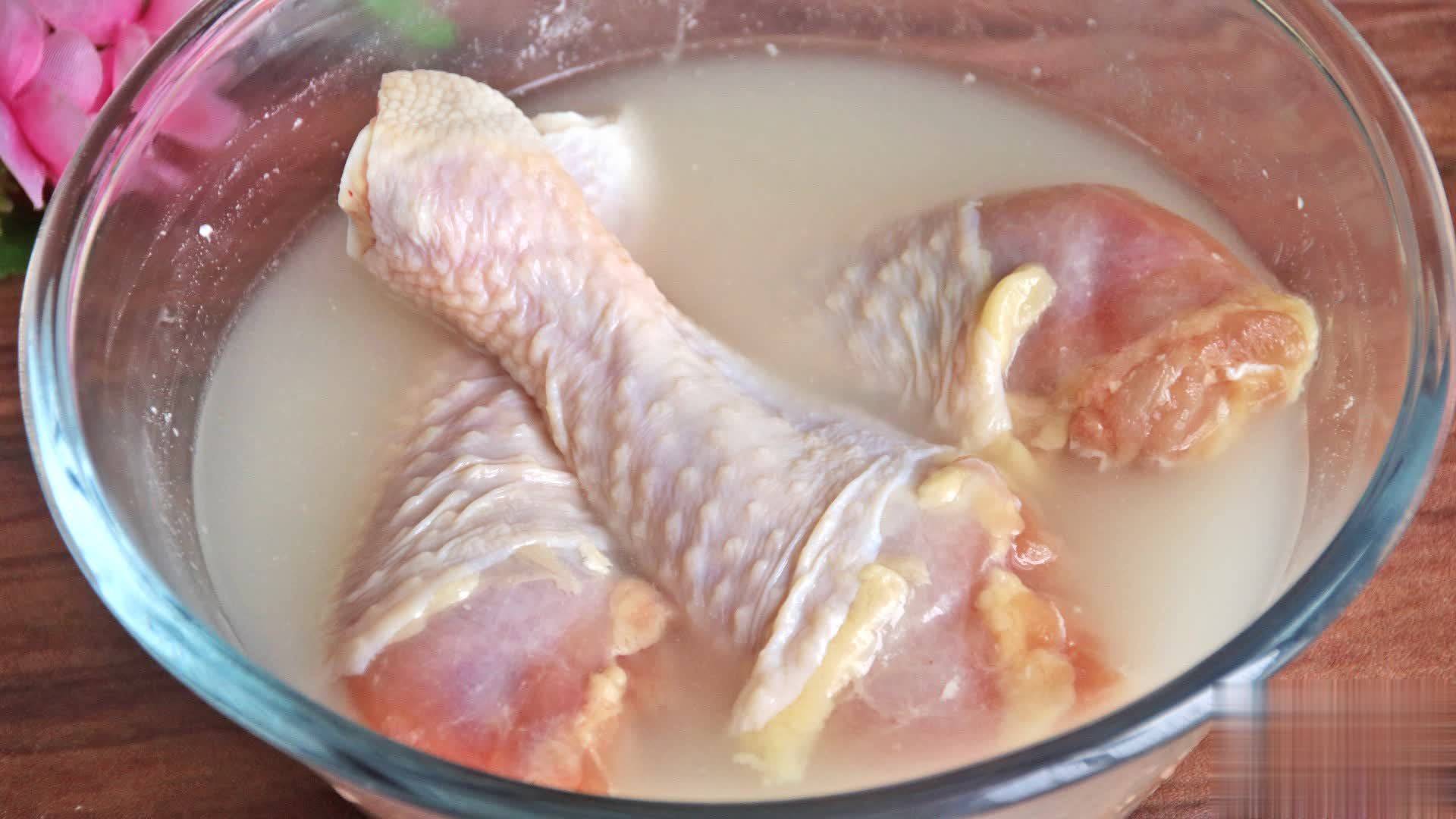第一步:准备3个鸡腿,放入一个大碗中,加一大勺面粉、一小勺盐,给它抓拌揉搓,盐能消毒杀菌,面粉有很好的吸附作用,接着放清水里多洗几遍,洗去污渍和血水,再用厨房纸巾擦干表面的水分;