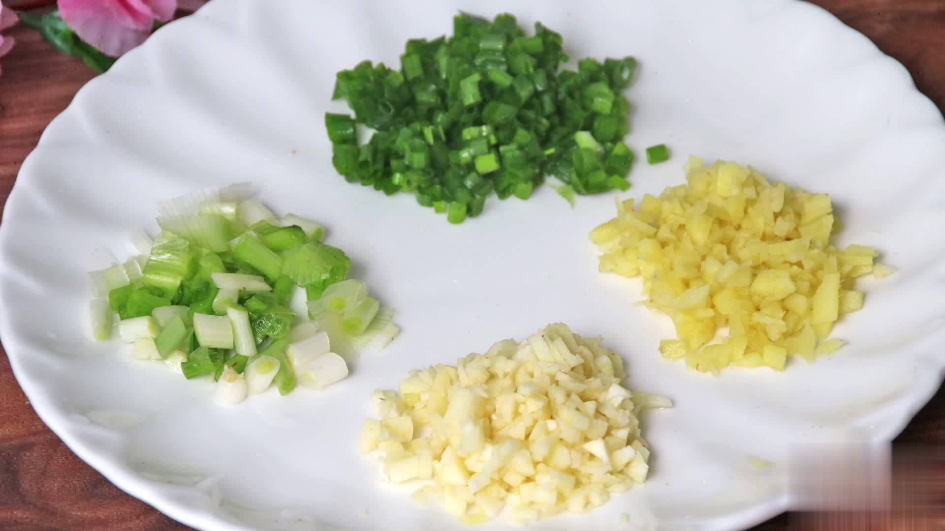 第六步:切点葱姜蒜,小葱切葱花,葱白分开切,大蒜生姜切沫;